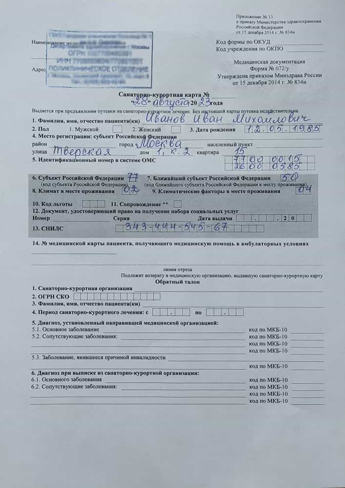 Согласно приказа Минздравсоцразвития РФ заполняется бланк формы 072/у-04 для взрослых, а для детей форма 076/у-04. В санаторно-курортную карту вносятся записи результатов исследований.